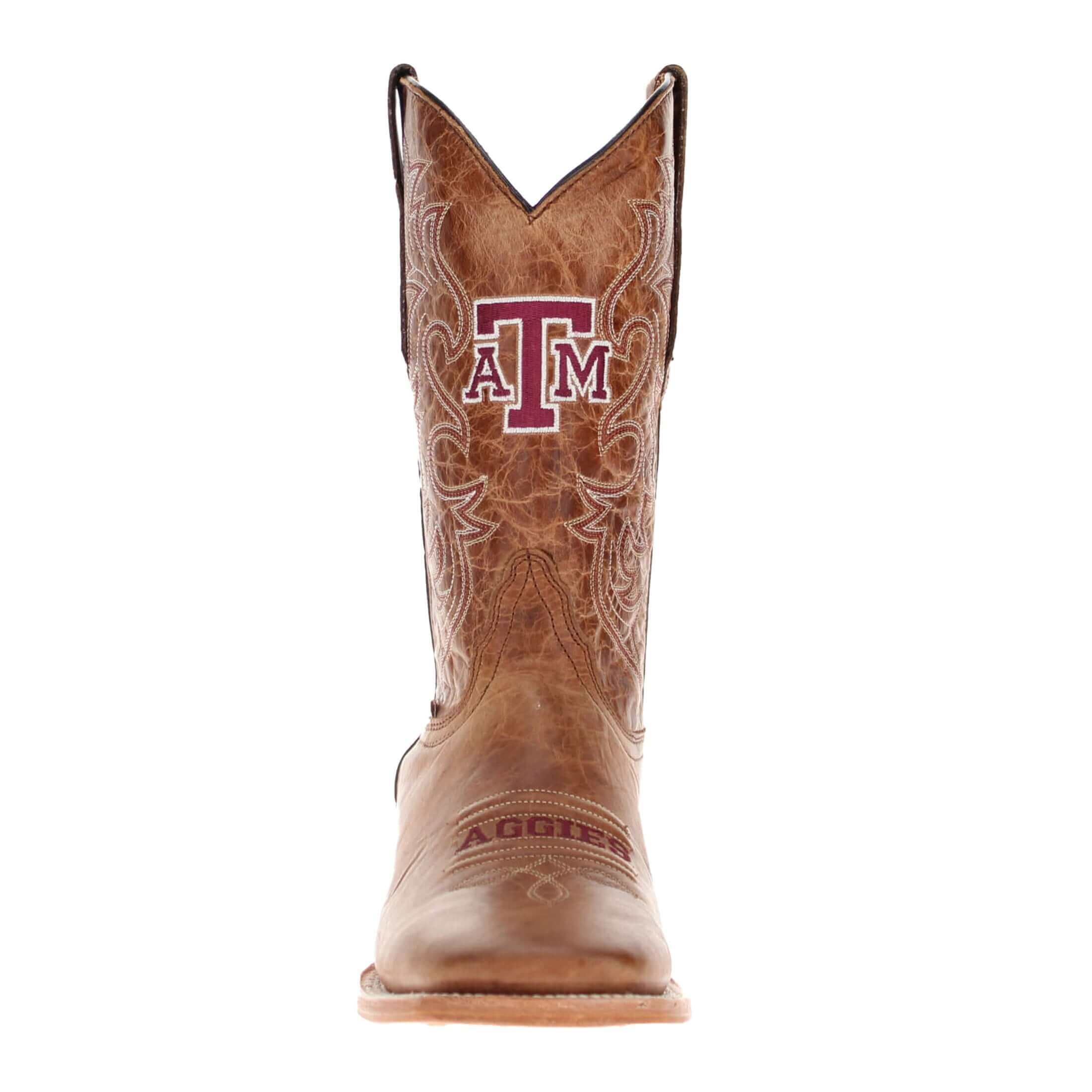 Step into game day with pride and style wearing our brand new officially licensed Texas A&M University cowboy boots. The Aggies logo is prominently displayed on the foot, making it clear where your allegiances lie. Whether you’re at the game, tailgating, or just going about your day, proudly showcase your Aggies pride with every step. Gig 'Em, Aggies!